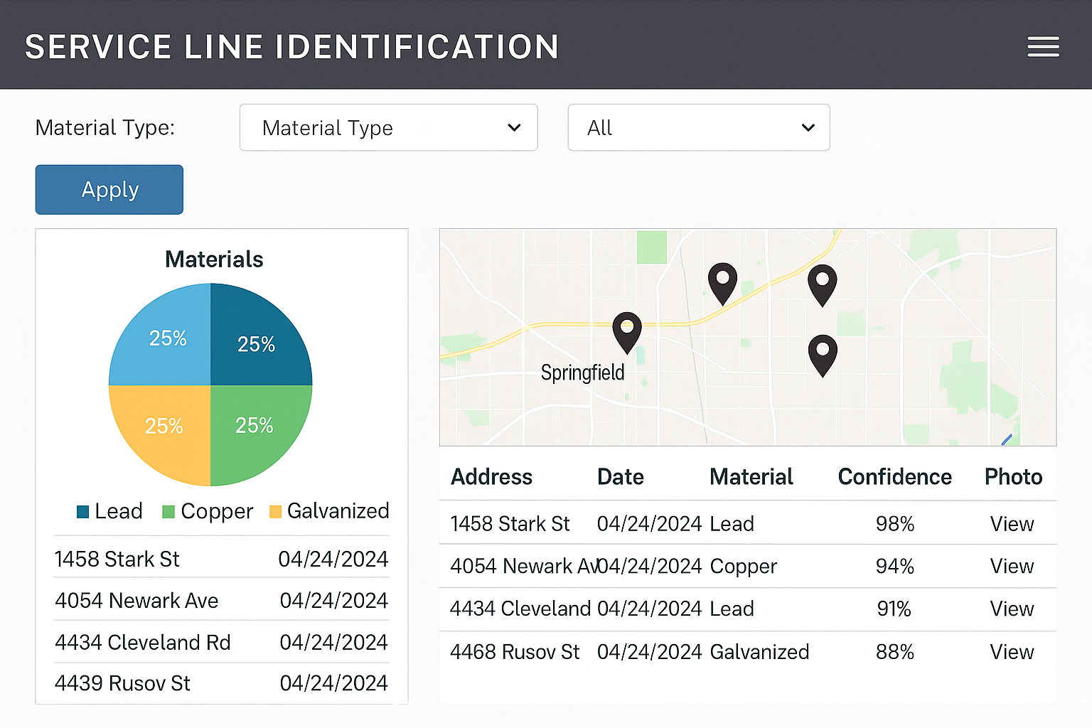 All submissions are available in real time through a secure, easy to use dashboard. Each record includes the address, material type, confidence score, any other utility information requested, and the photo for audit and verification. Utilities can generate custom reports simplifying all your regulatory requirements. All the data is encrypted and stored safely, ensuring privacy and reliability every step of the way.